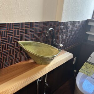 トイレ洗面は目地にえんじ色を使用して、落ち着きのある雰囲気に仕上がりました。