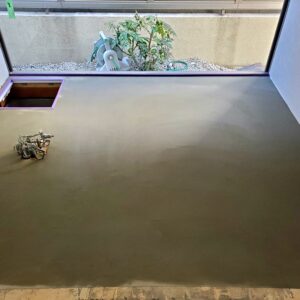 レベリングは流動性の高い樹脂モルタルで、コンクリート金鏝仕上げの後、床の精度を上げる材料です。