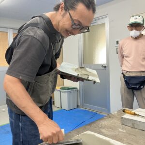 普段使用している補修材、レベリング材の製造工程、施工方法の説明、試験方法などなど盛りだくさんの内容でした、名古屋市南区の左官屋