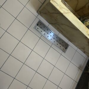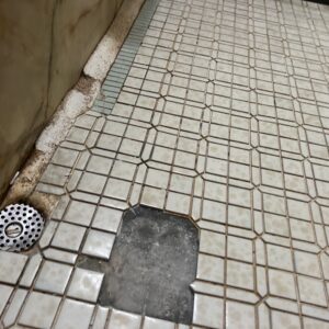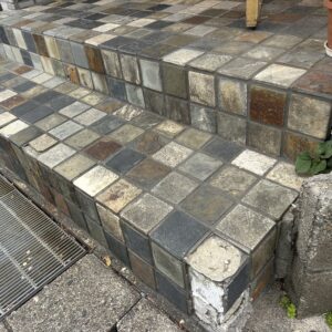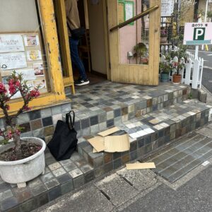 カフェ出入口のタイルなのですが、お客様が既存のタイルを気に入っていて同じように直せるか心配していました。下見に行ったところ、剥がれていなくてもぐらつきがある箇所もあったので80枚くらいは貼り替える予定です。