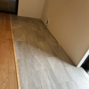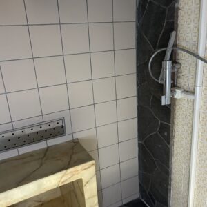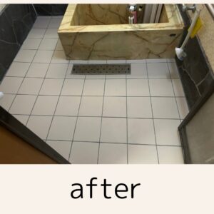 サーモタイルは浴室や洗面室用のタイルで、ざらざらしていて水場でも滑りにくいです。また熱が伝わる速度が遅く、ヒンヤリ感が軽減されます。床タイルを替えただけですが、もとの浴槽や壁が良いものだったので高級感ある仕上がりになりました!