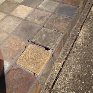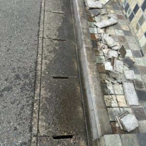カフェ出入口のタイルなのですが、お客様が既存のタイルを気に入っていて同じように直せるか心配していました。下見に行ったところ、剥がれていなくてもぐらつきがある箇所もあったので80枚くらいは貼り替える予定です。