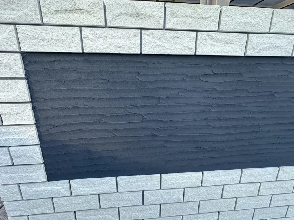 アイカ工業の「ジョリパット」を用いた、意匠性の高い塀の施工事例です。採用したパターン「グラディウス」は、剣先ゴテを横に引いて約30cmのラインを刻む手法で、ラインをあえて重ならないようランダムに配置することで豊かな表情が生まれます。壁面全体への施工はもちろん、門塀の一部などにワンポイントとして取り入れることで、外構のデザイン性を手軽に引き立てることが可能です。
