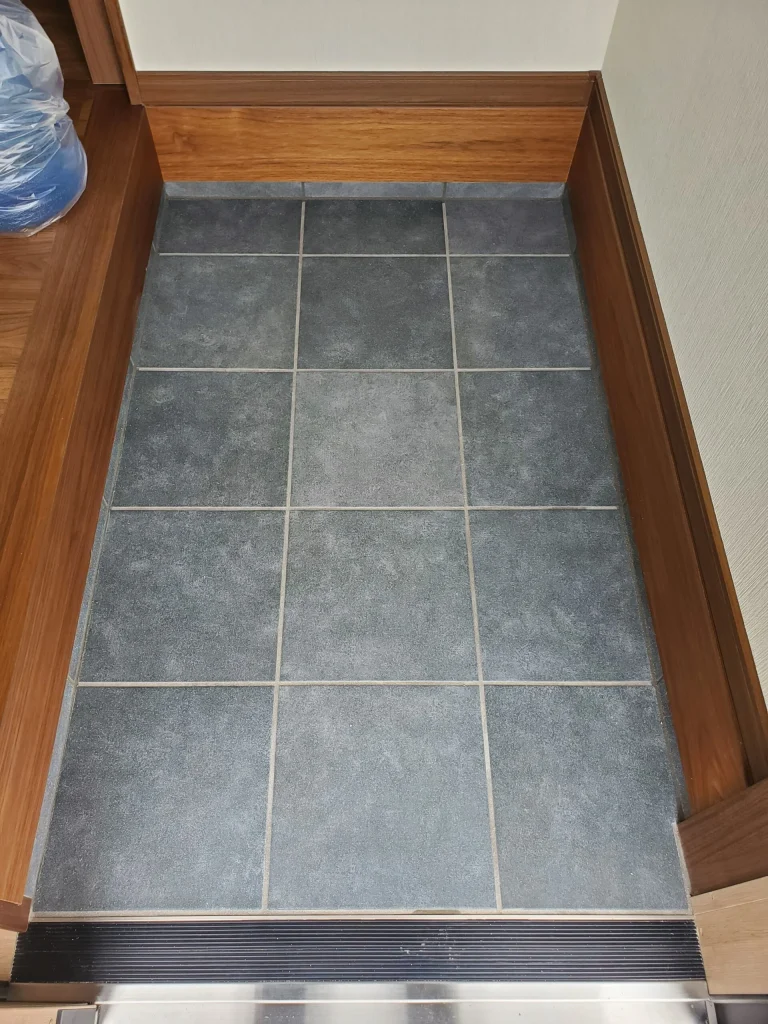 タイルの施工は、下地作り、タイル張り、目地込みという一連の基本工程を丁寧に行うことが、長期的な耐久性と美観を支えます。今回使用したLIXILの「パセオ」は、質感が良く足元を上品に演出するタイルです。下地の精度を整えることでタイルの割付けが美しく決まり、最終的な目地入れによって全体の統一感が生み出されます。基礎に忠実な施工が、タイルの魅力を最大限に引き出します。
