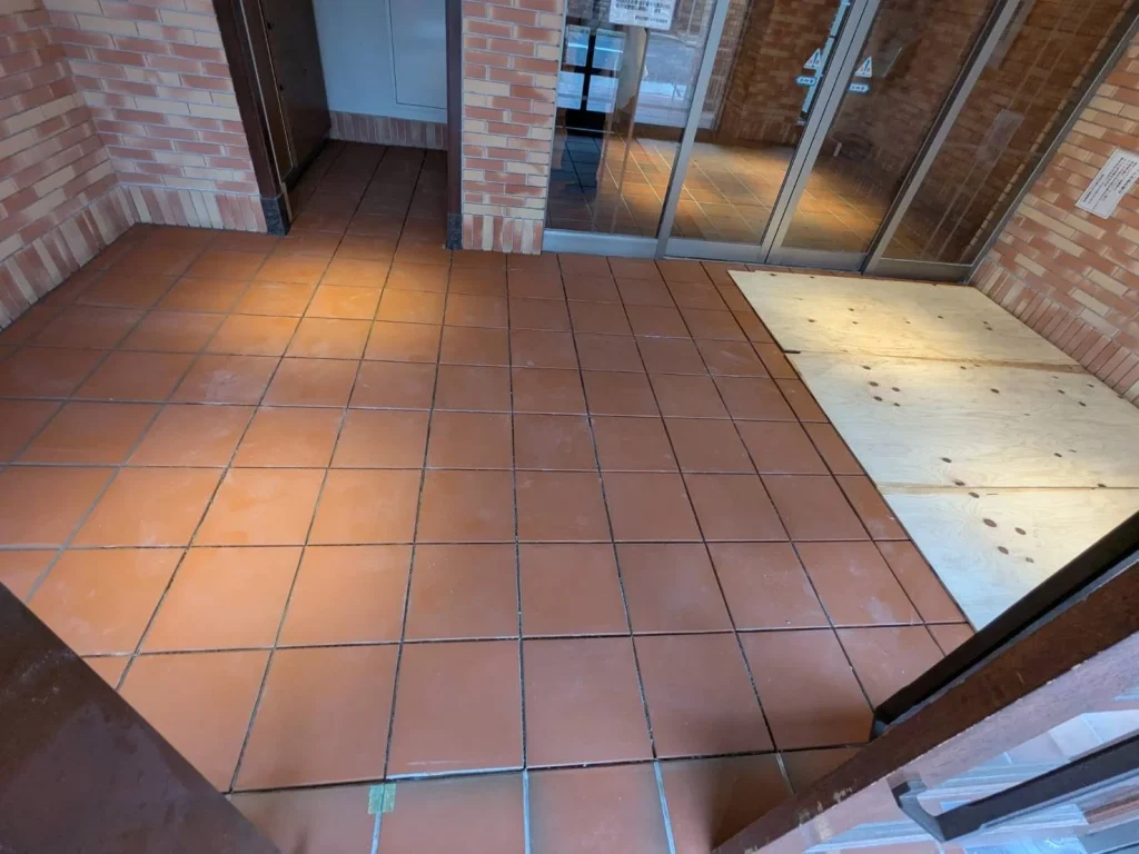 マンションエントランスにおける床タイルの浮き補修と張替工程