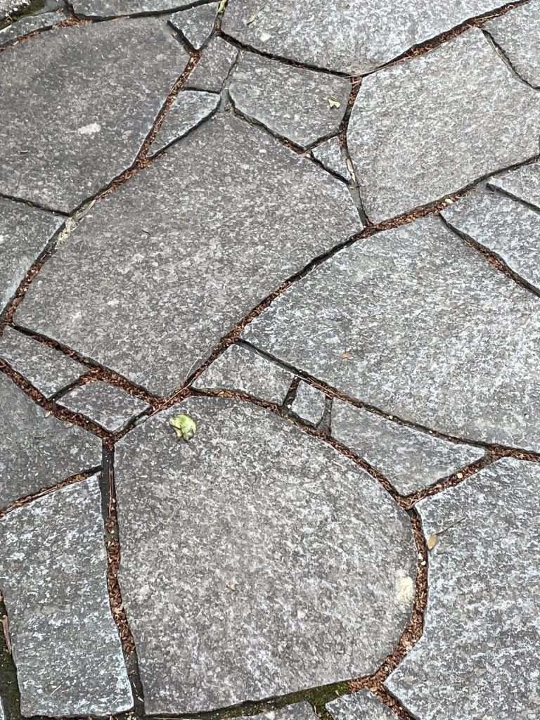 愛知県大府市内の公園で見受けられた、非常に精度の高い乱形石貼りの施工事例です。石材一つひとつの形を合わせ、均一かつ細い目地幅で構成された仕上がりは、石工職人の高度な技術と手間が反映されています。乱形石貼りは石の選別や加工にセンスと根気を要しますが、このように緻密に組み上げることで、歩行のしやすさと共に、公共空間にふさわしい重厚で美しい景観を生み出しています。