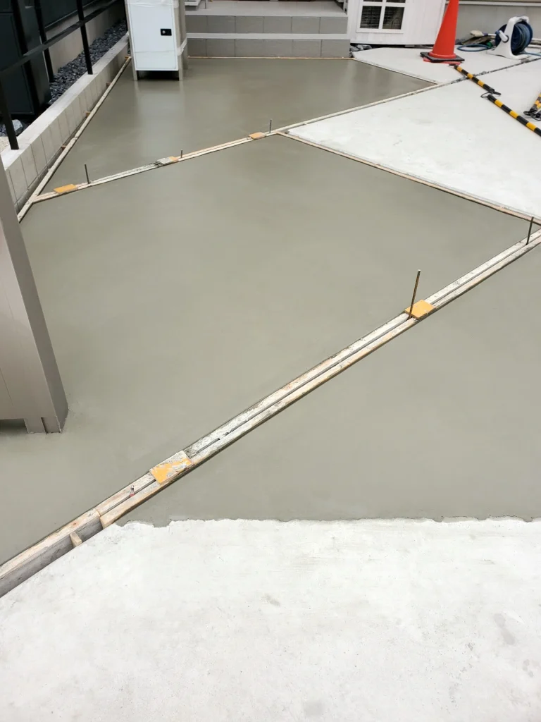 土間コンクリートの表面を金鏝で平滑に磨き上げる仕上げ施工です。気温が高い日の施工では、コンクリートの硬化速度が速まるため、タイミングを見極めた迅速な鏝捌きが求められます。特に面取り(角の面出し)箇所が多い現場では、ひび割れや角欠けを防ぐための丁寧な縁取り作業が重要です。熟練の技術で表面を緻密に押さえることにより、粉塵の発生を抑えた、耐摩耗性の高い美しい床面が完成します。