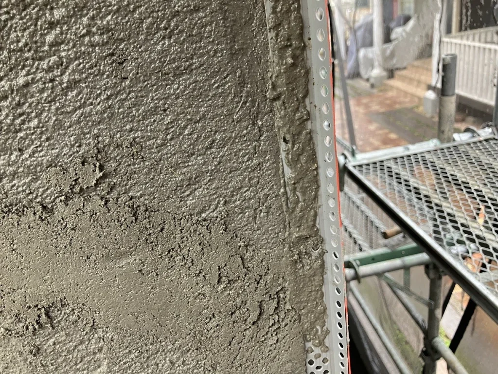 外壁モルタルの下塗り工程において、建物の角(出隅)に「コーナー定木」と呼ばれるプラスチック製の役物を設置する施工です。定木を設置する際は、水糸を張り、垂直・水平なラインを正確に出すことが重要です。この工程を丁寧に行うことで、仕上がりの角が歪むのを防ぎ、シャープで美しい外壁ラインを実現します。コーナー定木は、モルタルの剥落防止や角の強度向上にも寄与する、左官仕上げの品質を左右する重要な下地処理です。